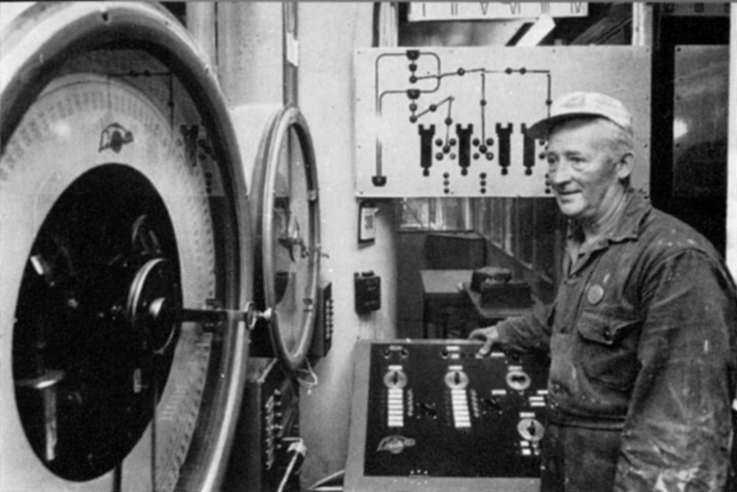 Det väser och fräser från de 14 maskinerna och med rytmisk precision lyfter mekaniska armar en aldrig sinande ström färdiga men ännu rödglödgade flaskor eller burkar ut på transportbanden för vidare befordran till kylröret. Frank Jacobsson är en av maskinskötarna, som just nu ger formarna en omgång smörja. Därefter lyfter han för inspektion upp en just nu aktuell burk för gurkinläggning, vilken tillverkas vid en av maskinerna. Från maskinerna går vi till avsyningen. Det är både män och kvinnor som har detta ansvarsfulla jobb, och det gäller för Henry Hagström, Laila Nordqvist och deras kollegor att ha ögonen med sig, när de synar av alla dessa förpackningar som är på väg till packning och utlastning.