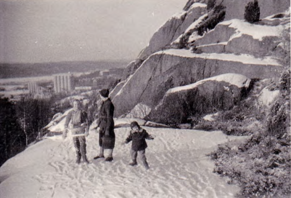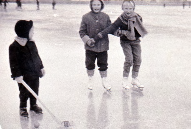Där åker vi skridskor eller skidor och har matsäck med oss och värmer oss vid elden som pappa gjort upp. Ibland bogserar pappa mej med skidstavarna och då kan det gå undan så att vinden riktigt biter i kinderna. Det hissnar i magen utav farten. Är det nyspolat på Idrottsplan går vi barn dit på förkvällen och åker skridskor i strålkastarskenet. Vi flickor åker mest paråkning och pojkarna spelar bandy. Efter några timmars åkning går vi trötta och frusna hemåt, äter kvällsmat och därefter är det dags för den varma sköna sängen.