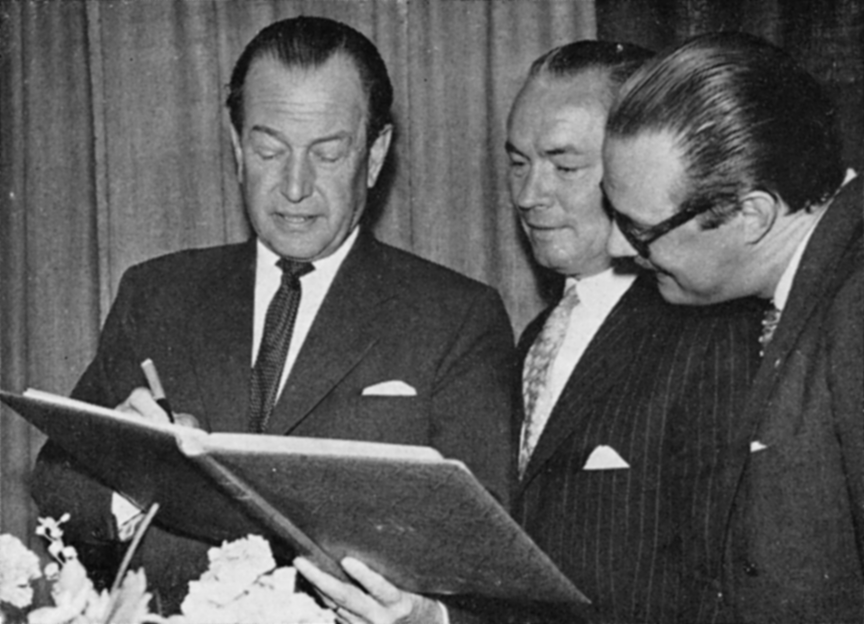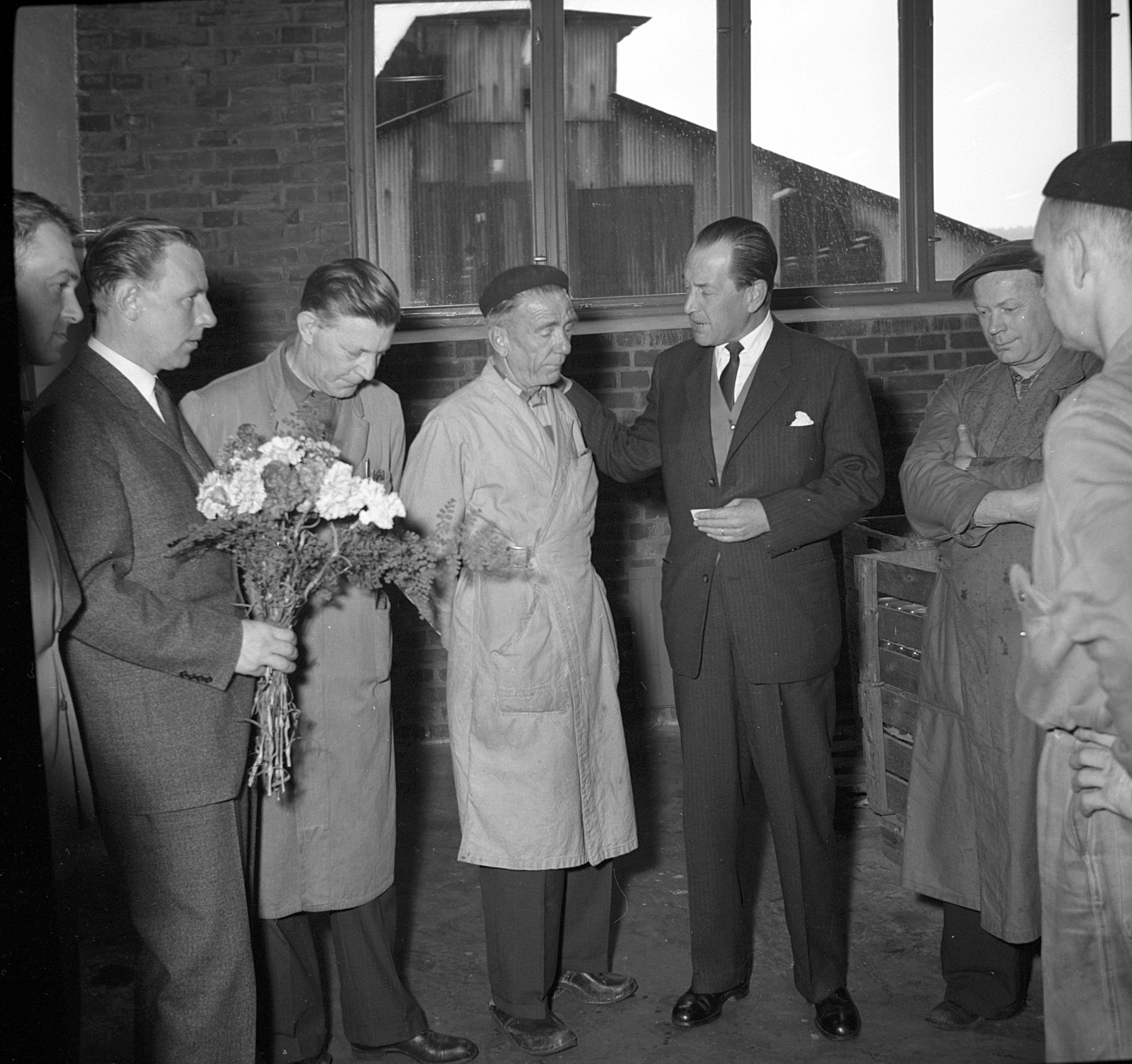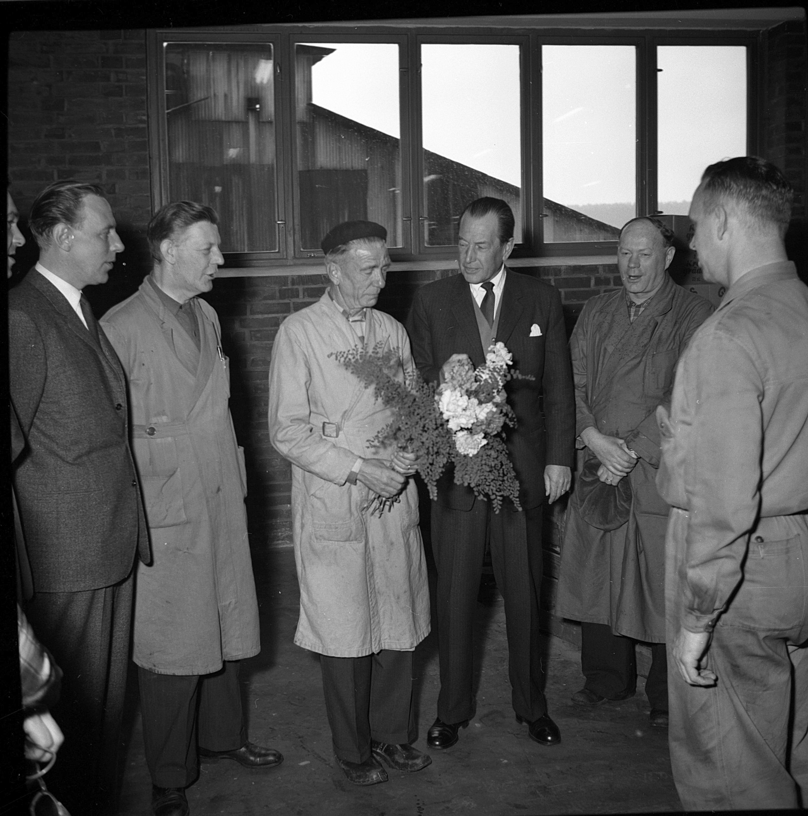 Sex representanter för olika sammanslutningar avskedstalade så och överlämnade blommor och presenter, överingenjör Lennart Hanserud talade för tjänstemännen, ingenjör Gunnar Jönsson för SIF-klulbben, verkmästare Gunnar Svensson för arbetsledareklubben, fackföreningens vice ordförande, Tage Friberg, för fackföreningen, fru Astrid Börjesson för Nödinge folkpensionärsförening och kommunalfullmäktiges ordförande, Erik Alexandersson, för Nödinge kommun.