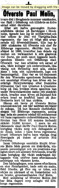 Han gjorde ofta besök på glasbruket och beskrives som en hjälpsam man som bisträckte dom anställda med penningar så att de själva kunde iordningsställa en ugn och fortsätta tillverkningen. Villkoret var att han själv fick ombesörja försäljningen. Efter en tids provdrift fann han det värt att fortsätta rörelsen, överste Melin torde vara den som räddade glasbruket ifrån undergång.