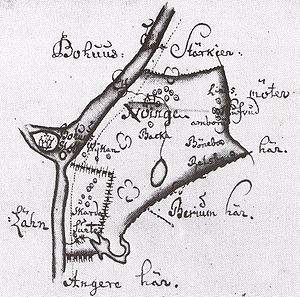 Nödinge socken inklusive Skårdals skate ca 1715. Skårdalsområdet hörde då fortfarande till Bohuslän.